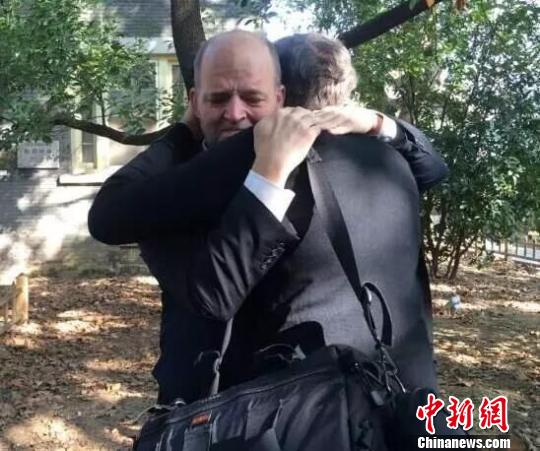 克里斯托弗·拉贝与克里斯·马吉在约翰·拉贝铜像前拥抱。 潘琳娜 摄