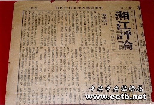 《湘江评论》是湖南学生联合会的机关报,是以评论为主的四开四版的小型报纸,辟有西方大事评述、东方大事评述、世界杂评、湘江杂评、放言、新文艺等栏目。