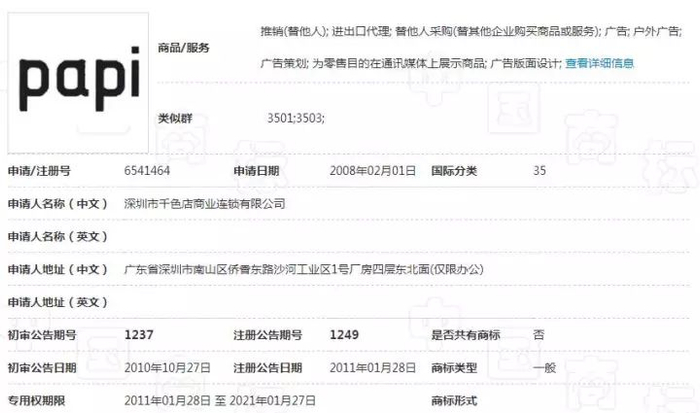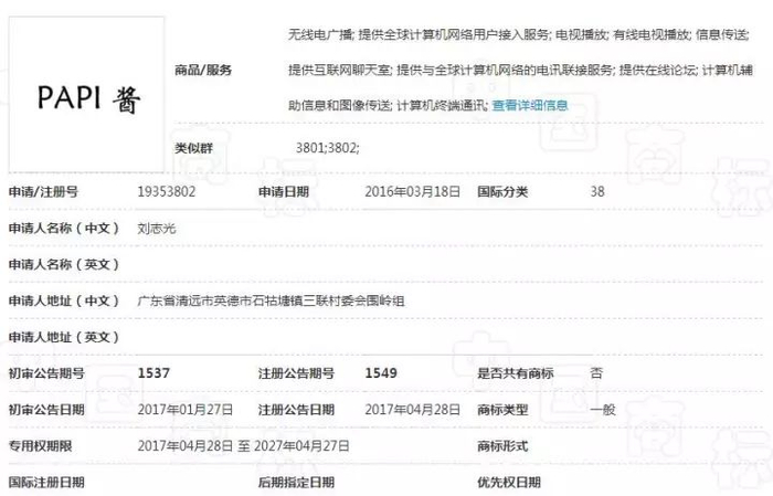 注册时间在2016年初,不排除在2015年“papi酱”走红时被他人抢注了此商标。