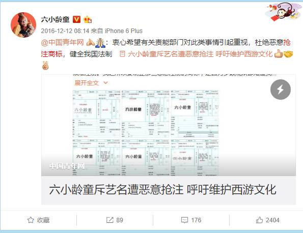 有类似烦恼的可不止是papi酱一个人。去年12月,六小龄童就通过微博表示“六小龄童”这个艺名被恶意抢注商标,并晒出不少以“六小龄童”为名的不同产品及商标,呼吁对“西游文化”等相关经典品牌进行维护。
