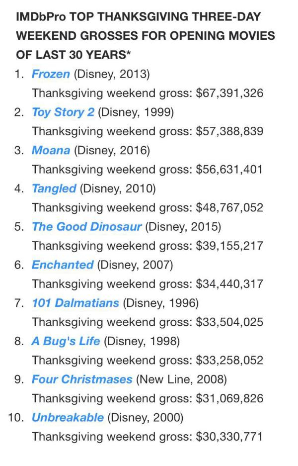 IMDbPro网站11月21日公布的近30年票房最好的感恩节档电影。当时文章中就说,“今年《寻梦环游记》上映之后,榜单可能会发生变化”,果然它跻身前十。