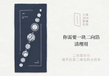 《三体日历》新春礼盒的礼品全是春节期间的实用小物,包括利是封、春联和毛巾,但看起来却很有科幻感,最有意思的是那块二向箔毛巾,展开后为二维化的太阳系,科幻爱好者应该很容易想到《银河漫游指南》里的台词,“如果你觉得世界要毁灭了,带好你的毛巾吧。”