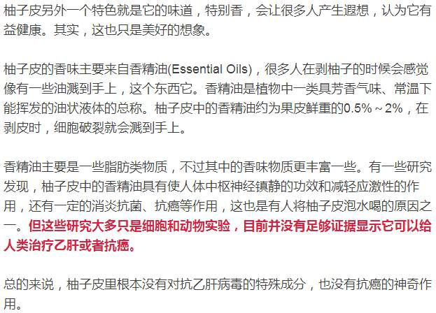 3 柚子皮里根本没有对抗乙肝病毒的特殊成分,也没有抗癌的神奇作用。