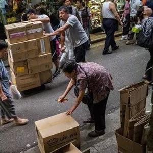 ▲香港工人们把纸皮搬上货船。(美国《纽约时报》)