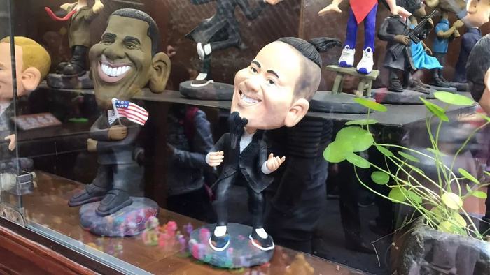 在成都宽窄巷子里,一名捏面人的艺人把自己的快乐形象摆放在了美国前总统奥巴马小像的旁边 新华社记者 刘坤 摄