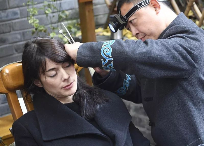 11月的成都,一名外国女子在成都的竹椅上,享受地道“老成都”的“掏耳朵” 新华社记者 刘坤 摄