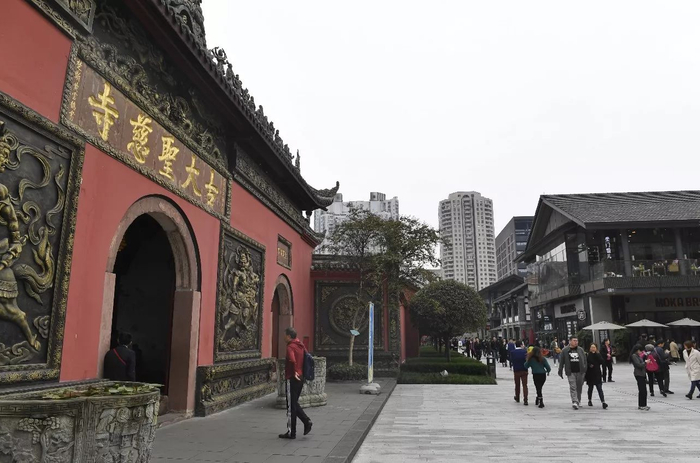 在成都最繁华的百年商业老街春熙路不远处,矗立着一座千年古刹——大慈寺。史载,唐玄奘就在这里受戒。而大慈寺院门咫尺之外,就是各类餐厅名店、咖啡水吧汇聚的“太古里商业区”。
