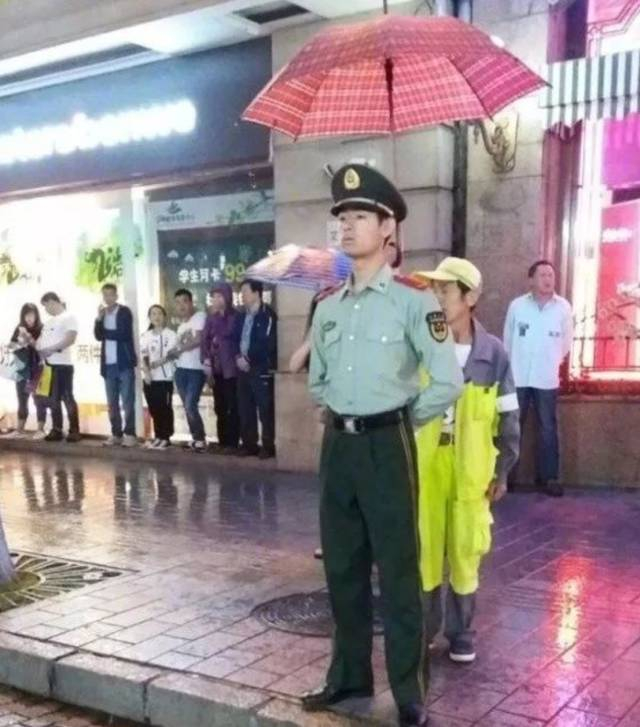 可能是在下雨天为执勤士兵撑伞,自己却被淋湿的清洁工人。