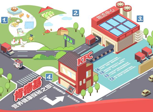 “肯德基营养健康探秘之旅”是这幅漫画的背景活动,它真正的名字叫做“肯德基食品安全流程图”,基本呈现了从白羽鸡养殖、蔬菜种植到检验检疫、物流运输,再到原料进入肯德基餐厅的全部环节。