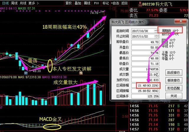科大讯飞(002230)股价底部连续出现企稳十字星,资金大幅流入,均线金叉出现,本人及时选出在讲解布局的机会,4连阳之后股价进入平台整理阶段,资金趋势不改,与股价形成明显背离,符合我讲解过的加仓思路,果然,之后股价三根大阳线创出新高,虽然盈利空间不是很大,截止目前为止,81个交易日涨幅超过43%,但相信很多我的圈子的人还是很开心的。
