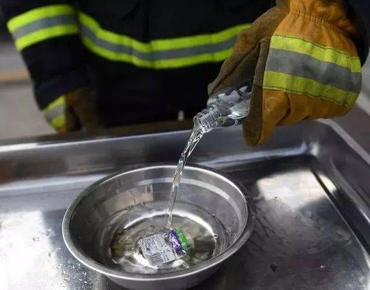 实验开始,消防员在铁碗里倒入200毫升浓度为75%的医用酒精。