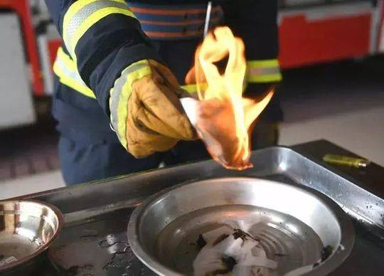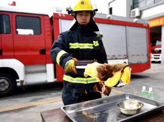 消防员用打火机将酒精点燃后,用一根被干毛巾包裹着的棍子把铁碗打翻,模拟正常用餐时不慎将火锅打翻的情景。