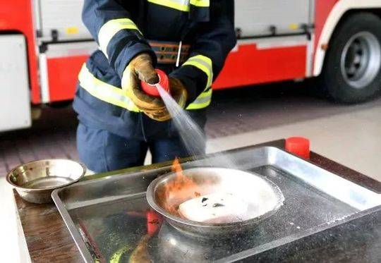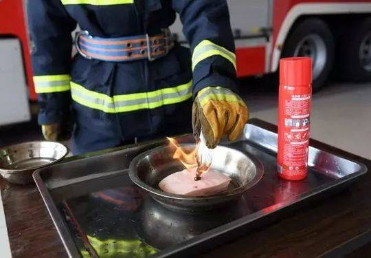 消防员先将带皮猪肉表面的酒精点燃,数秒后,用水雾型灭火剂对着碗内进行灭火。
