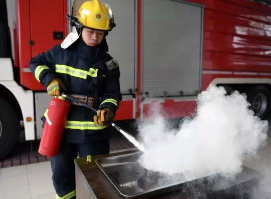 将猪肉表面清理干净后,再次倒上酒精并点燃,然后用干粉灭火器对着碗内进行灭火。