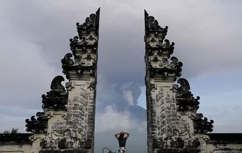 11月27日,在印度尼西亚巴厘岛,一名游客参观寺庙时观看喷发的阿贡火山。印尼火山和地质灾害减灾中心报告说,25日下午5时30分,巴厘岛上的阿贡火山再次喷发出大量火山灰,灰柱高达1500米。此后阿贡火山不断喷出火山灰和烟雾,火山灰柱最高达到4000米并伴有红光,火山可能随时喷发岩浆。