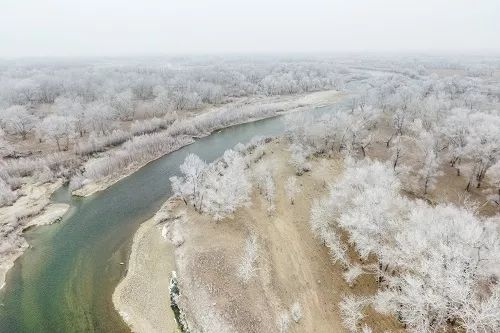 这是11月27日航拍的新疆额尔齐斯河流域的雾凇景观。当日,新疆维吾尔自治区北屯市额尔齐斯河流域出现雾凇,从高空俯瞰,整个河谷地带银装素裹,宛如仙境。