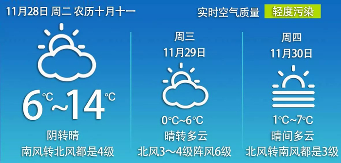 根据济南市气象台预报,27日夜间到28日白天阴转晴,南风转北风都是4级阵风6~7级,28日最低气温济阳、商河2℃左右,市区及其他县区6℃左右,28日最高气温14℃左右。28日夜间到29日晴转多云,北风3~4级阵风6级逐渐减弱到3级,最低气温济阳、商河-4℃左右,市区及其他县区0℃左右,最高气温6℃左右。30日晴间多云,北风转南风都是3级,最高气温7℃左右。12月1~2日晴到少云,南风3级,气温回升。12月3~4日晴,北风3级,气温下降。