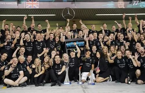 11月26日,梅赛德斯车队车手博塔斯(中)、汉密尔顿(中右)与车队工作人员庆祝夺冠。当日,在阿联酋阿布扎比举行的2017赛季世界一级方程式赛车(F1)阿布扎比站正赛中,梅赛德斯车队芬兰车手博塔斯夺冠,梅赛德斯车队英国车手汉密尔顿获得亚军,法拉利车队德国车手维泰尔获得季军。