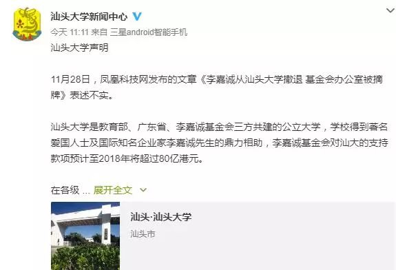 11月28日,凤凰科技网发布的文章《李嘉诚从汕头大学撤退 基金会办公室被摘牌》与事实不符。