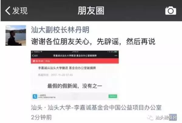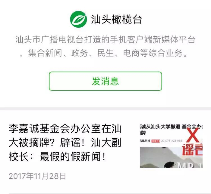 今天上午,微信认证为“汕头市广播电视台”的账号“汕头橄榄台”发布消息称:汕头大学副校长林丹明于今天10时38分发布微信朋友圈,转发了包含“李嘉诚从汕头大学撤退 基金会办公室被摘牌——最假的假新闻,没有之一”字样的图片。