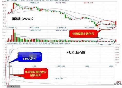 从上面图示可以看出,股票集合竟价时量比放大(具体数值好像没注意),股价高开高走,量能配合理想,从K线图上看,股价处在下跌趋势中,近期缩量整理,有止跌意味。当股票某天量比突然放大时,就是短线介入点。