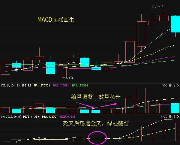 MACD“起死回生”战法指的技术特征是:MACD指标出现死叉后,在随后的几天内重新形成金叉。此现象多数是主力机构在拉升前进行震仓制造MACD指标死叉空头陷阱来骗取散户卖出手中筹码,然后迅速拉升股价,不让卖出筹码的散户有逢低重新买回的机会。