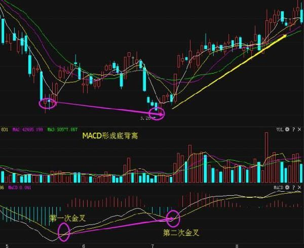 (2)第一次金叉的位置是在第二个底比第一个底低的位置,买点是第二个底MACD金叉的位置。