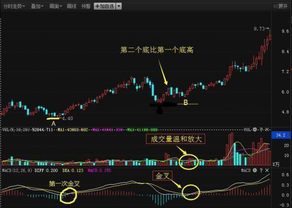市场上升趋势代表市场环境良好,主力控制市场的能力非常强,MACD出现底部降低,这说明市场处于跌无可跌的状态。MACD金叉代表市场将要启动,成交量放量代表主力资金开始入场。