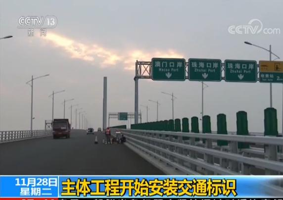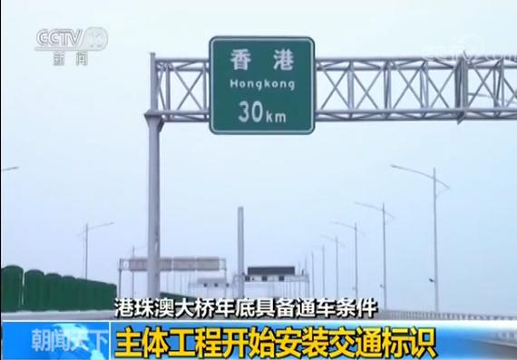 央视记者 张雷:我现在这个位置是港珠澳大桥珠海和澳门方向的起点,我旁边这些护栏以及路灯还有机电设施都进入到了最后安装的尾声。现在大桥的道路指示标识也进入到全面的安装阶段,在我身后就可以看到一块刚刚安装上去的香港方向的指示标识,这里距香港30公里。
