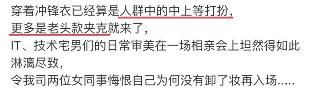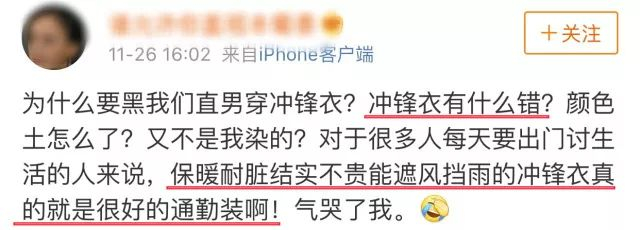 @木啊三啊杉:我以前初中的时候因为喜欢的男生爱穿冲锋衣就也买了一件蓝色冲锋衣。后来到了高中,舍友都说我像纺织厂里的女工。