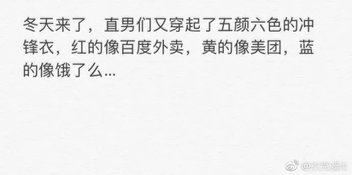 天一冷,男人们穿上了各色的冲锋衣:黄的像美团,蓝的像饿了么