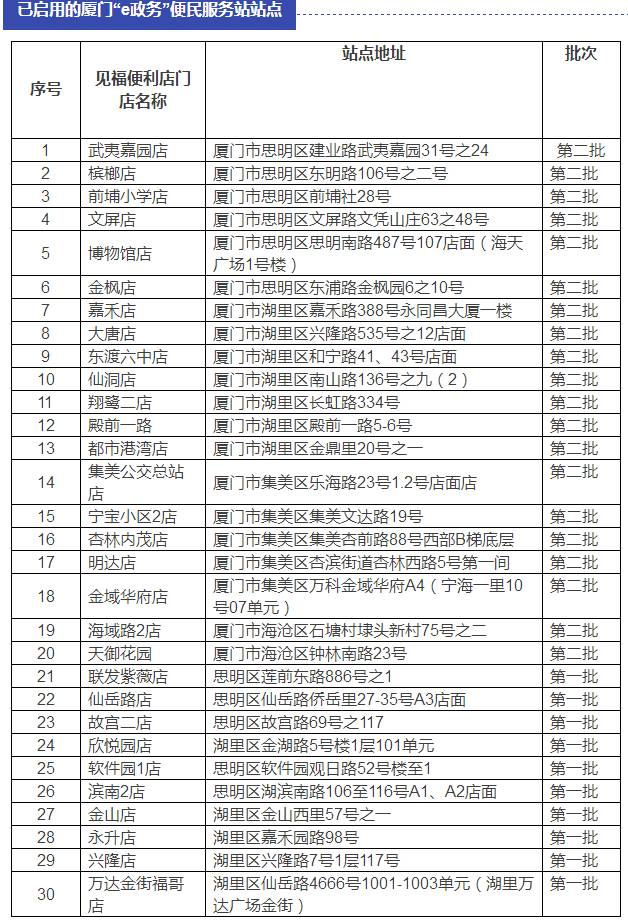 据悉,第二批厦门“e政务”便民服务站区域分布情况分别为:思明区6家、湖里区7家、集美区5家、海沧区2家。由此,厦门“e政务”便民服务站点现已达30个。