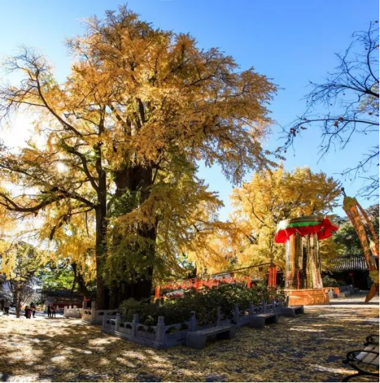 西山大觉寺千年银杏树最为世人所知,它高达30多米,干周长7.8米,种植于宋辽时期,距今已近千年。这里不但观赏银杏叶,红叶也是分外妖娆。古刹,红叶、银杏交相辉映,散发着宁静祥和的美感。