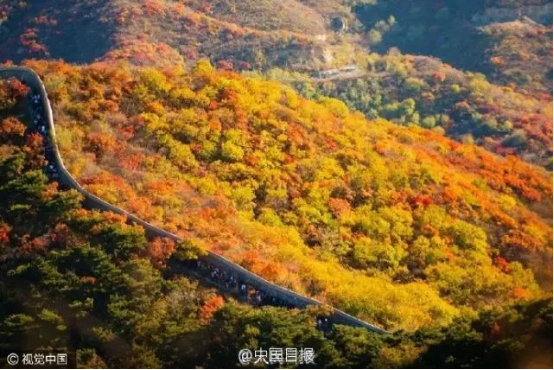 十月中旬前后,是慕田峪长城最绚烂恣意的季节,秋高气爽,云淡风轻。进入十月份,慕田峪长城旅游区内3000米的红叶带渐次染色,色彩斑斓的红叶映衬着雄伟壮丽的长城,为我们勾勒出一幅幅如诗如画般的金秋胜景,让游客尽情享受如梦似幻的长城“枫”情。长城台阶比较陡峭,可选择乘坐缆车上山,缆车双程100元,单程80元。
