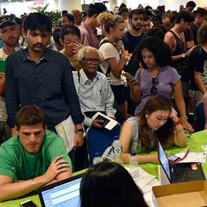 2017年11月27日,在印度尼西亚巴厘岛伍拉莱国际机场,乘客与机场工作人员沟通。 新华社 图