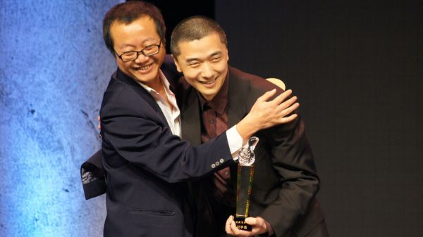 资料图片:2014年11月2日,美籍华裔科幻作家刘宇昆(左)和科幻作家刘慈欣在星云奖红毯同科幻迷互动。 当日,第五届全球华语科幻星云奖在北京举行颁奖典礼。新华社记者 李一博 摄