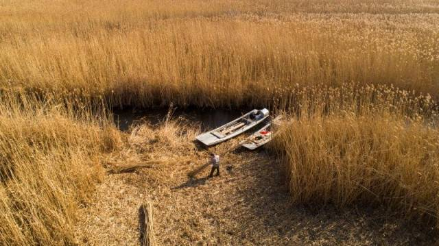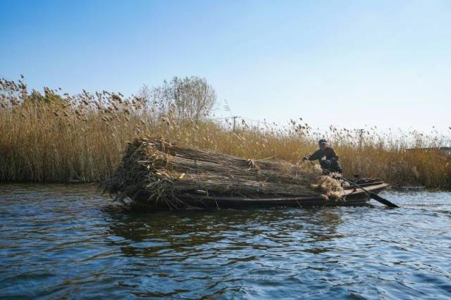 村落里的老农撑船进到淀中,手握一米来长的“打镰”熟练地把芦苇割下来捆成捆。淀泊中,不时有运送芦苇的船只划过,一船船芦苇金灿灿、沉甸甸。
