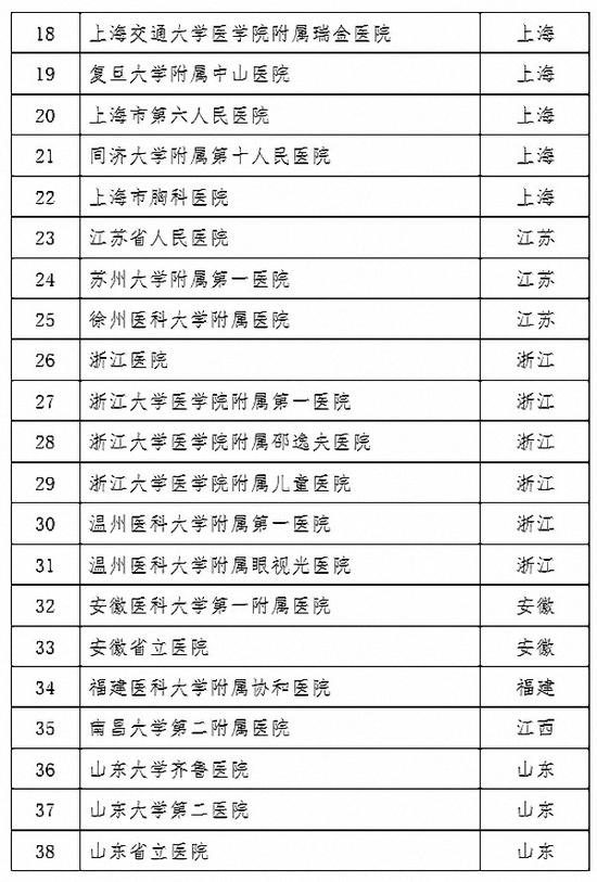 澎湃新闻(www.thepaper.cn)注意到,此次公布的名单中,广东省以10家医院的数量优势拔得头筹,紧随其后的上海、北京、浙江、山东、云南等省(市)也均有5-7家医院入选。