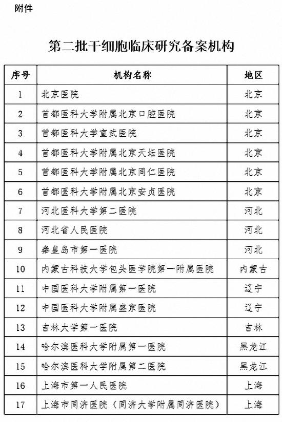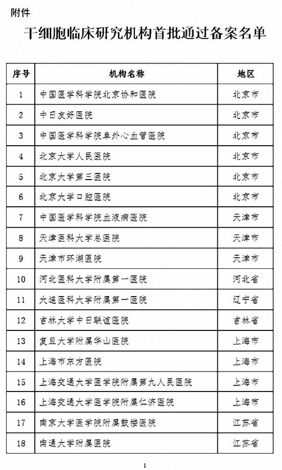 第一批干细胞临床研究机构首批通过备案名单