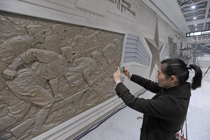 站厅的一整面艺术墙通过片段化的构图处理方式,严选真实历史题材元素,传达了勿忘历史,铁铸军魂的人民军队精神。