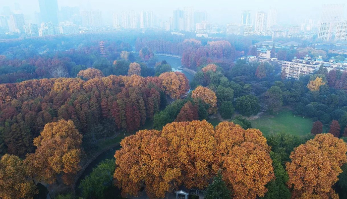昨天上午,位于汉口解放公园里的金色梧桐与泛红的水杉交相辉映,在绿色的松柏树的衬托下,编织成一幅初冬时节绚丽多彩的城市图画。