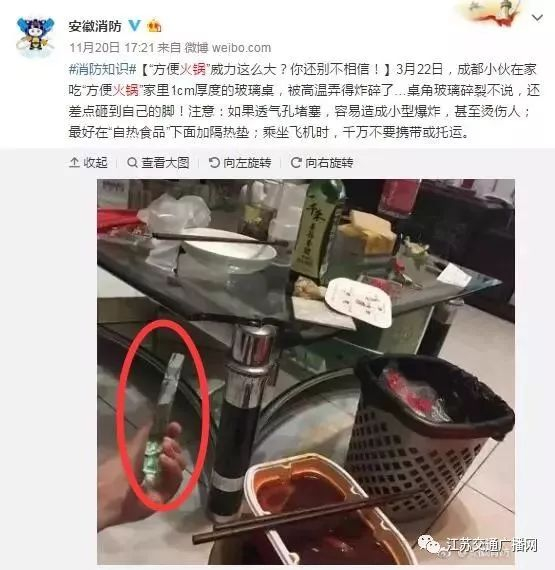 据报道,一名中国留学生在使用 “自热火锅”的时候,导致美国一寄宿学校全员疏散;成都一小伙在家吃“自热火锅”时,家里 1cm 厚度的玻璃桌在高温下被炸碎,还差点砸到自己的脚。