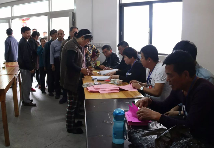 浙江省临海市下涨村村民在领取选票,参与村民委员会换届选举