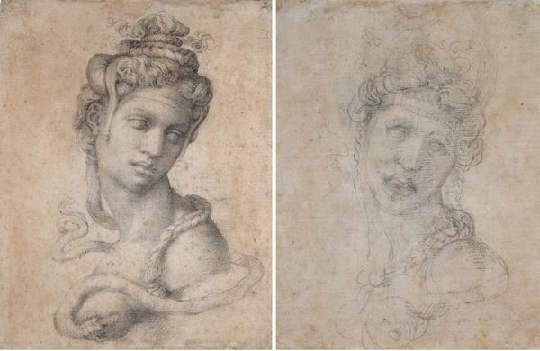 但本质上,他并没有改变。在他职业生涯的晚期,他还是一个工作狂,接过多的订单,时不时要和教皇们打交道,也创作诗歌,为其他艺术家提供草图让他们得以创作成油画。他的手和他的大脑都从未停息。大都会陈列的每件展品都称得上是一张工作表。艺术家每画一幅草图,都要经过调整后再画第二幅,再经过调整创造第三幅。画纸上的内容千奇百怪,有人体构造、圣徒、建筑灵感、色情涂鸦、尖叫的人、一句彼得拉克的诗句、一张珍爱的面空……对于一个天才而言,一幅旷世之作的诞生和所有这些元素密切相关,也是它们共同构筑了米开朗基罗的辉煌。