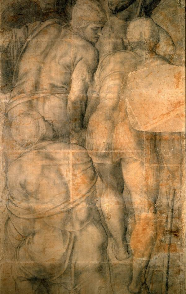 他巧妙地将画面谱成一曲由人体各个部分组成的复调大合唱:腹肌、胸大肌、背阔肌、臀大肌充斥着整个画面。每一个人物的草图都被仔细地保留了下来。整体布局的样图也同样完好无损,然而画面在灰尘成年累月的堆积下变得浑浊,仿佛一摊烟灰。巴斯提亚诺·达·桑迦洛绘制的巨幅在草稿被涂上石灰涂料前有幸亲眼见到了这些素描,而他之后于1540年创作的一幅大型油画作品则是对米开朗基罗原作的最佳见证。