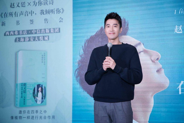 近日,赵又廷携手国际人文艺术平台“为你读诗”,联合出品首部双语有声诗歌专辑《在所有声音中,我倾听你》。11月26日下午,赵又廷现身西西弗书店上海大悦城店,参加主题为“光合作用”的新书签售会,与上海读者面对面交流,并在活动前接受了包括澎湃新闻在内的多家媒体采访。