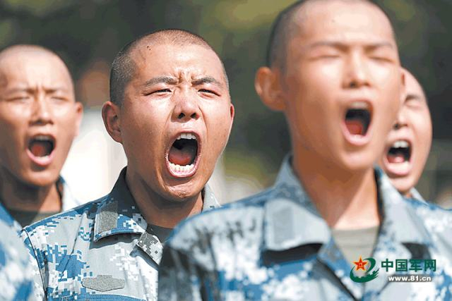 ↑入营之初,新兵付义义(左二)与战友们一起“吼出”血性。刘罗思亮 摄