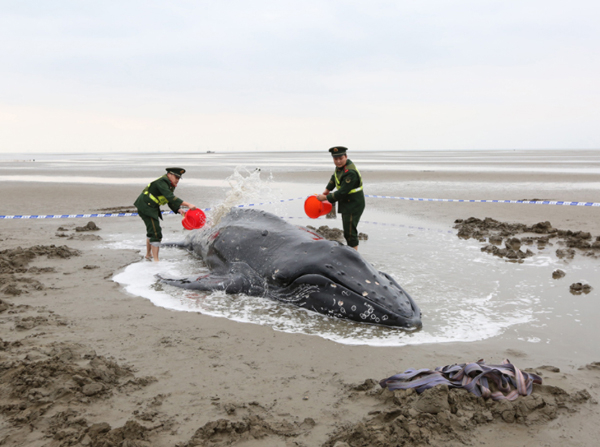 2017年11月13日中午,江苏南通启东,一只座头鲸搁浅在滩涂上被渔民发现。图为11月13日,边防民警向搁浅的座头鲸泼水以保持其体表湿润。 新华社 图