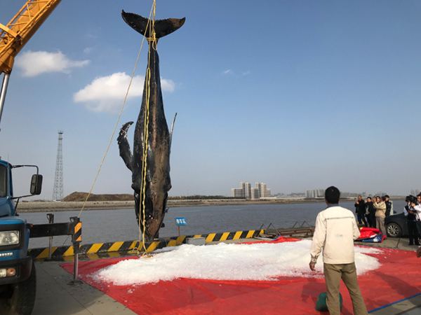 接下来的善后工作十分清晰明了:持续加冰保存尸体完整性、中标公司现场解剖、科研取样实验和标本制作同时进行,标本完成后将留在启东的鲸类保护馆。