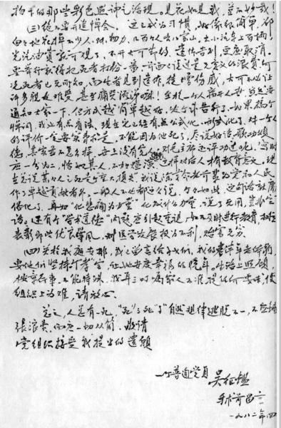 作为老一辈的共产党员,吴征鉴为国家作出过巨大贡献,然而他不愿为组织带来过多的烦恼。他在家信中写到,有什么困难,我相信你们能够设法克服。吴征鉴对于家人有着足够的信任。他还说,对我们这样美好的家庭,更应该做到安定团结、无论是兄弟、姊妹之间,还是妯娌之间,更甭说夫妻之间,都要相互扶持,互相爱护,互相信任,互相谅解,和睦相处,相安无事。绝不要闹无原则纠纷,切忌争吵,这将是对母亲最大的安慰。